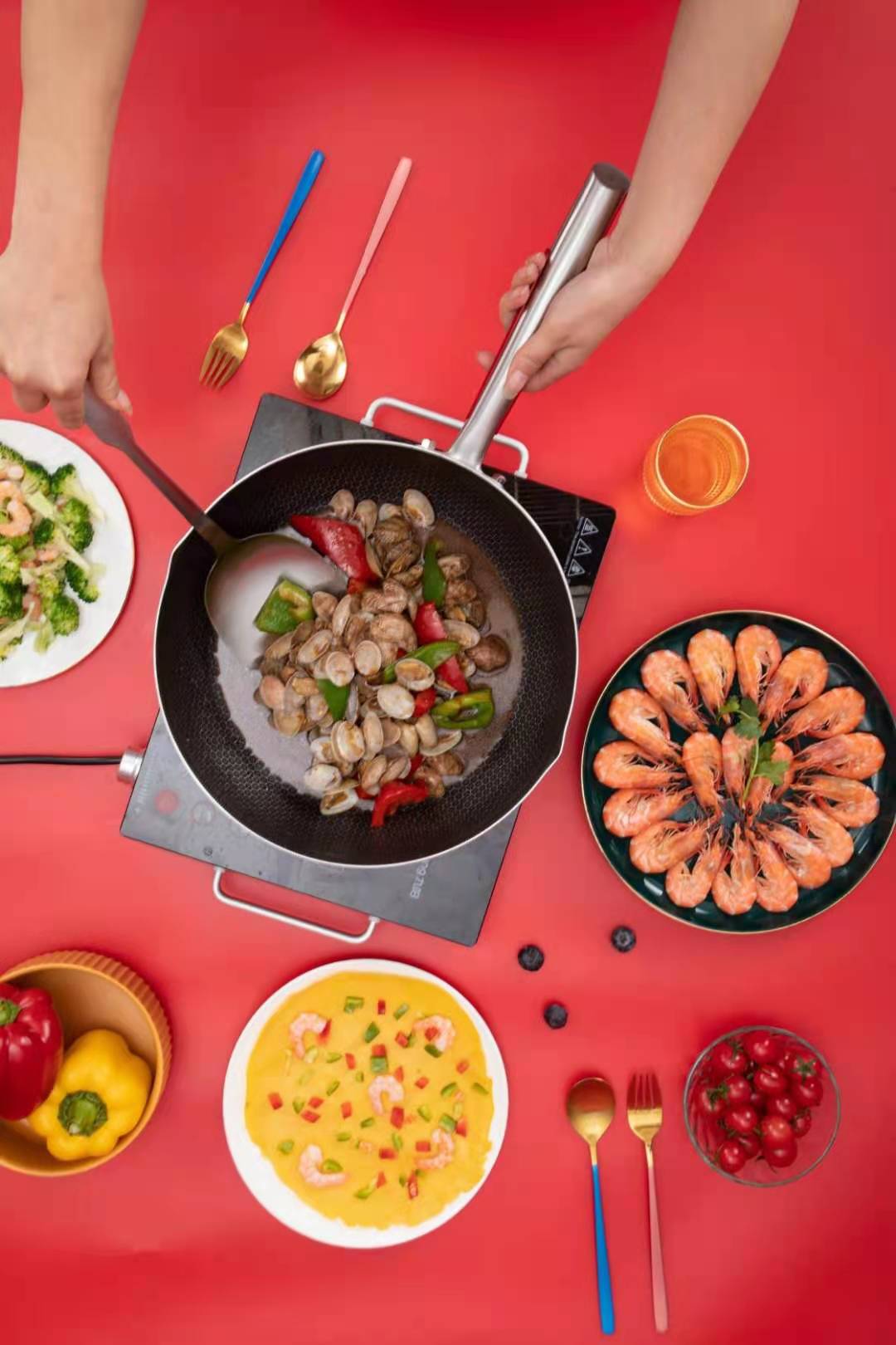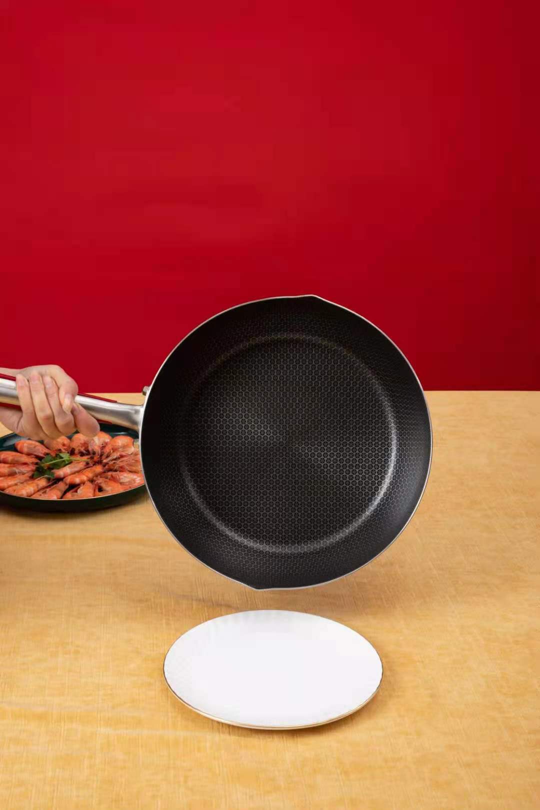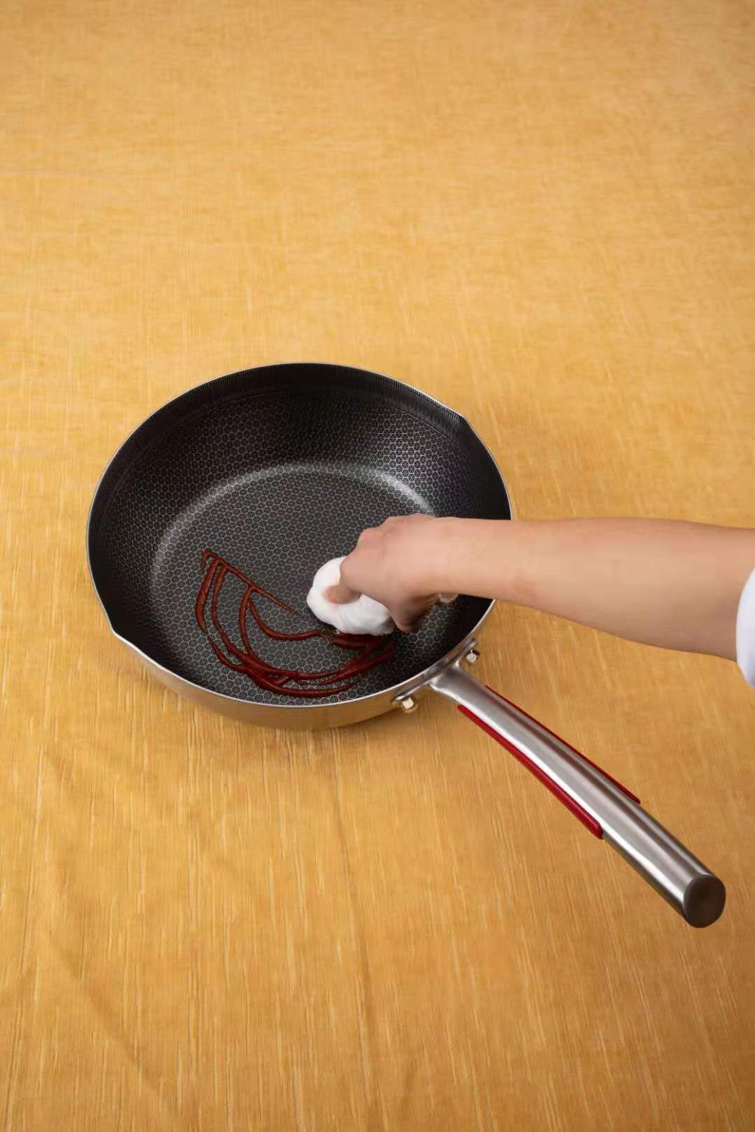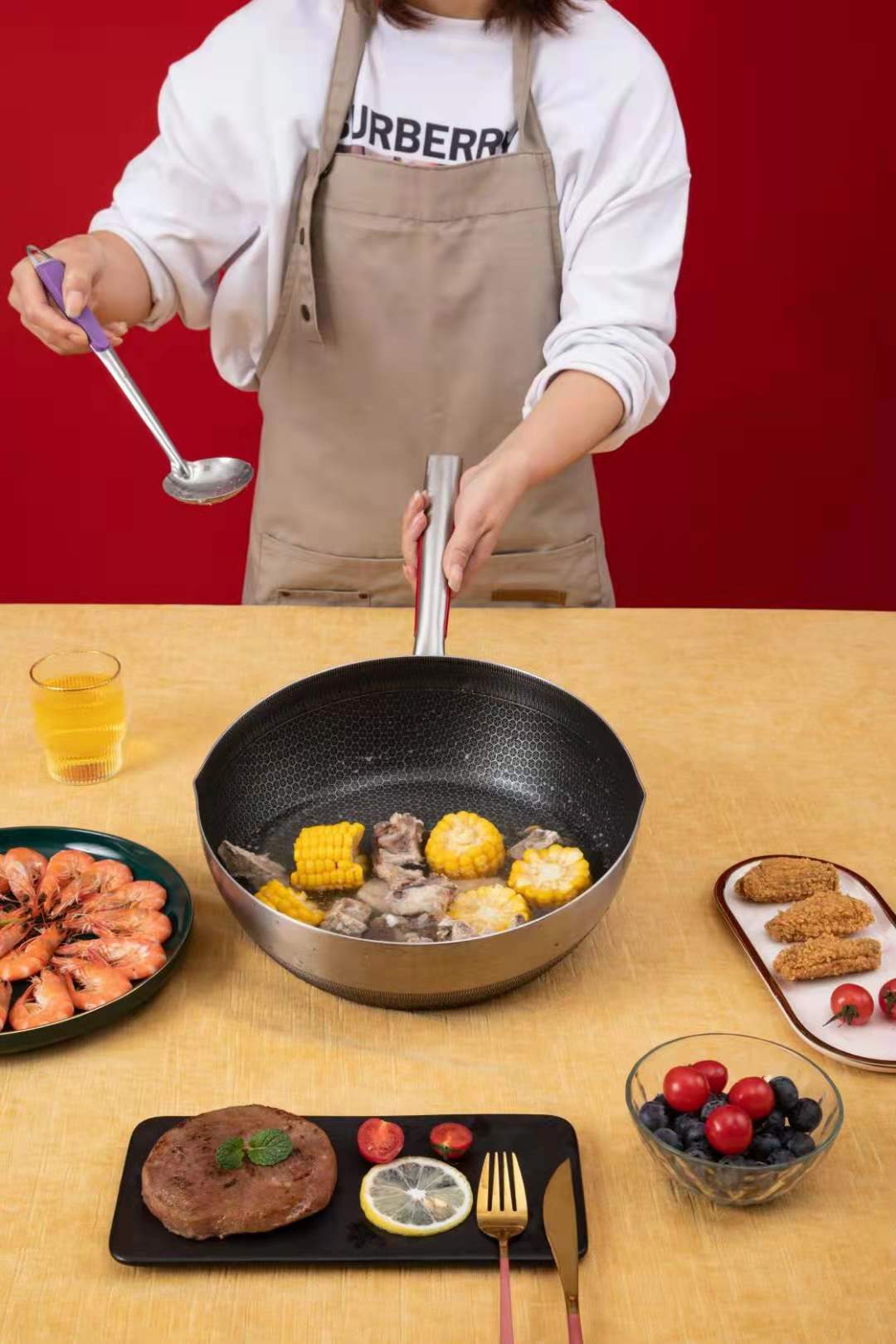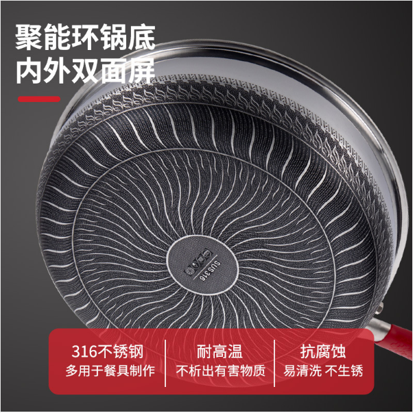 醫(yī)用級(jí)316材料+中間鋁合金+外層430不銹鋼,可以鐵鏟任意鏟,不粘鍋底,容易清洗,導(dǎo)熱快速均勻,少油煙。