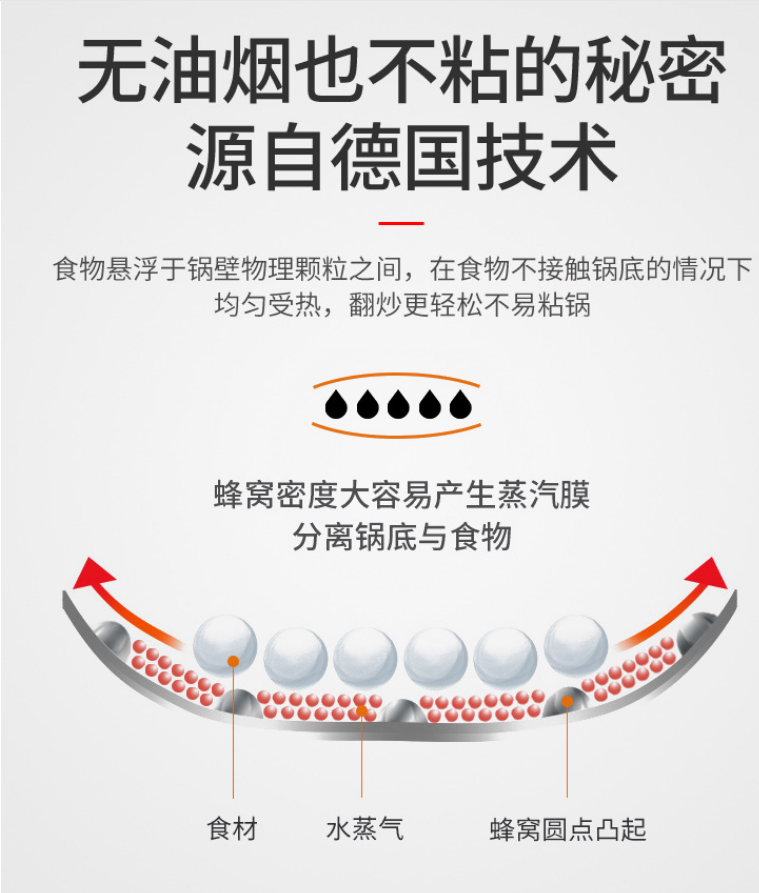 鍋體內(nèi)壁菱形紋蜂窩結(jié)構(gòu)設(shè)計(jì),在蜂窩保護(hù)層的分隔作用下,減少了食物于鍋面的接觸面積,懸浮式不粘效果更佳。